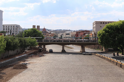 to start their wrecked Chevy sedan with its belts screaming and a policeman bending bemusedly over the open hood as traffic backed up behind it; here was a romantic arched stone bridge over a “river” that was a dry and paved bed with a car driving on it; there was a high green hill behind town with a statue on it; and come on but some of the architecture was simply absurd—a Gothic Southern mansion framed in cedar trees alongside a faded Coca Cola billboard, a baldly orange hotel in modular ovals like a relic of Communist Bulgaria, an entire skyscraper of green glass given over to storage with the windows on every floor piled high with junk; every fourth intersection closed and dug up for construction (glad I’d walked); wide hilltop plazas with vistas over abandoned industrial office buildings; lost alleyways past paint-peeling garages leading to fantasy stone footbridges over the green gorge...
